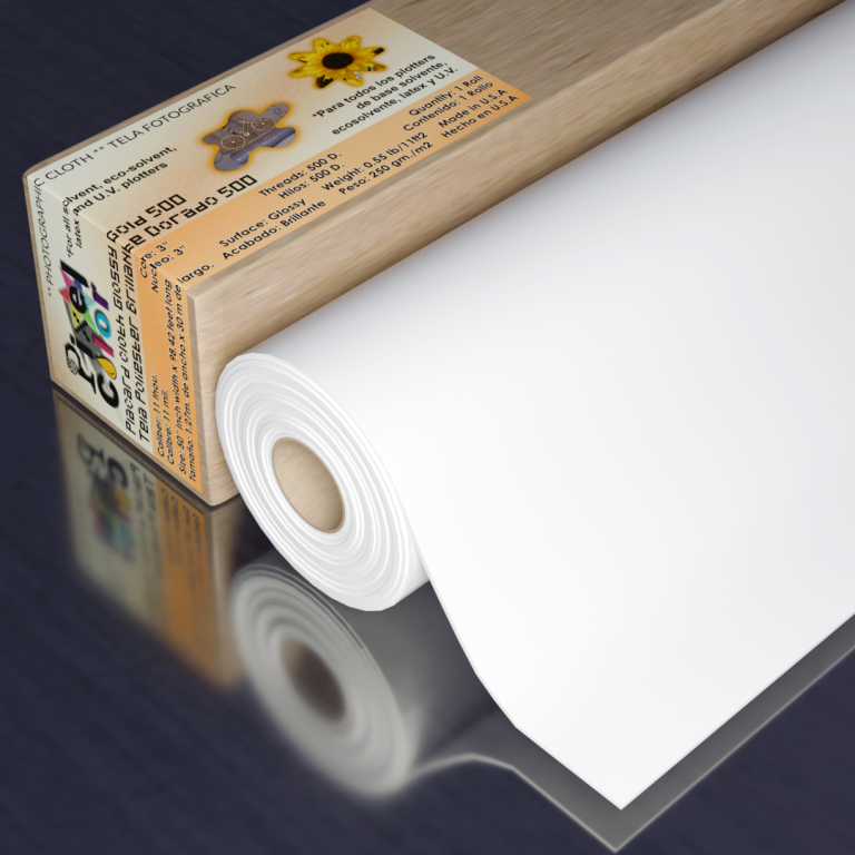 Material: Tela de poliester, de 500 hilos. Acabado: Dorado Brillante. Calibre: 11 milésimas. 250 gm. De 30 m. de largo por los anchos que se mencionan. Compatible con todos los plotters base solvente, ecosolvente, latex y UV de cualquier marca. Marca: Pixel Color.